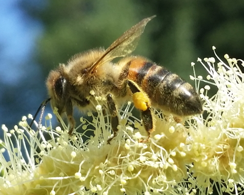 Honigbienen sehen eher bräunlich aus. Manchmal haben sie einen orangefarbenen Streifen am vorderen Teil des Hinterleibes. Die klassische gelb-schwarze „Biene Maja“-Darstellung der entsprechenden Zeichentrickserie und anderer zeichnerischer Abbildungen trifft eher nicht zu.